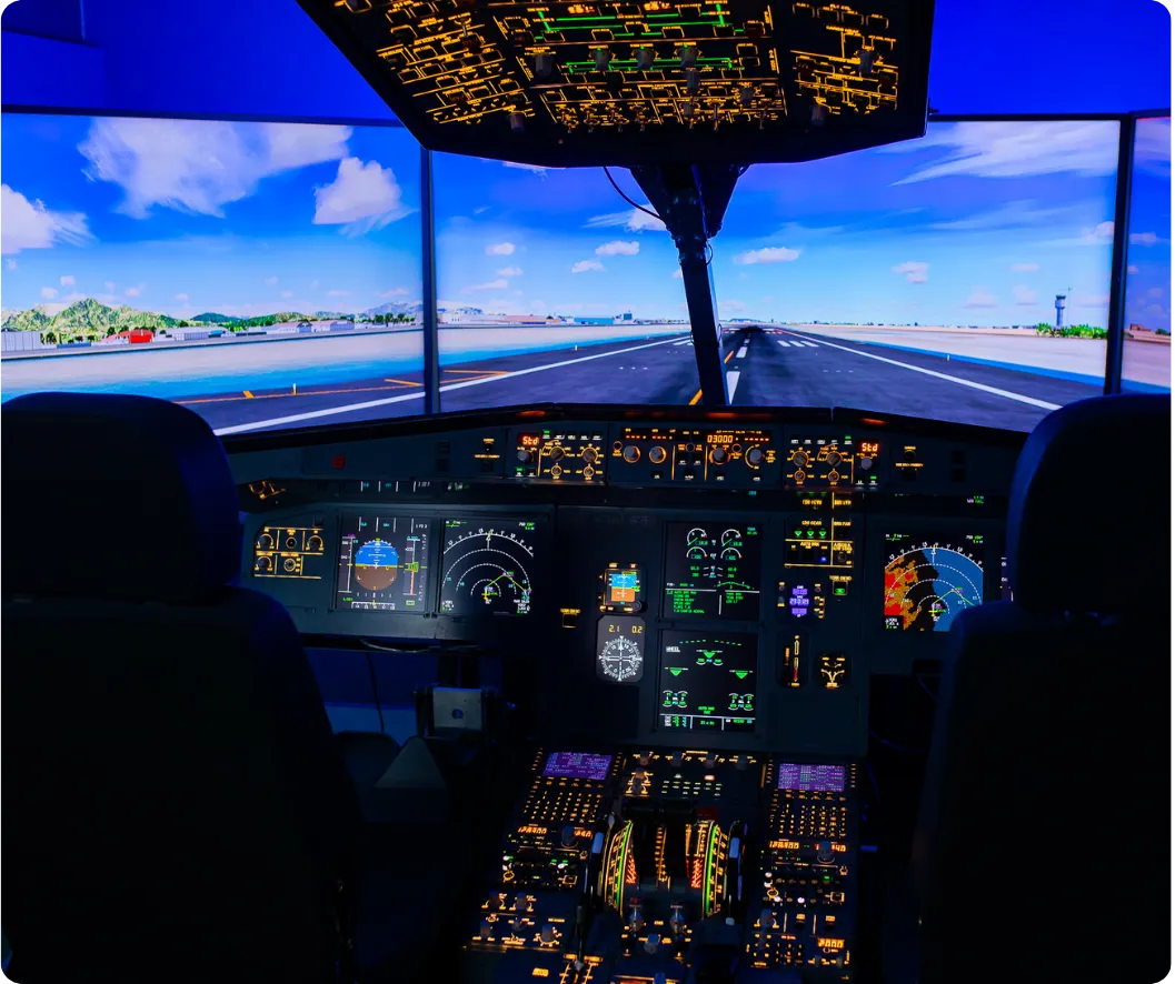 Entrenas en simuladores certificados Airbus A320, Redbird e IFR, con la misma tecnología que usan aerolíneas internacionales.